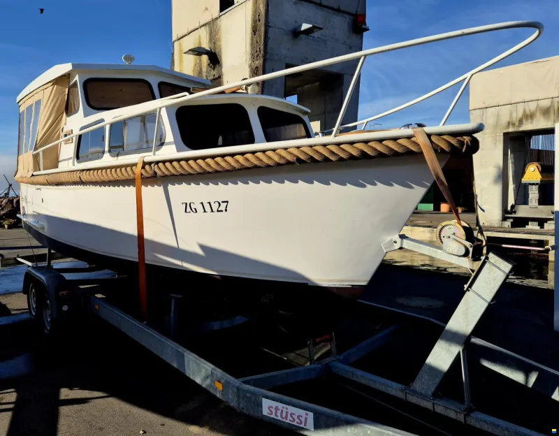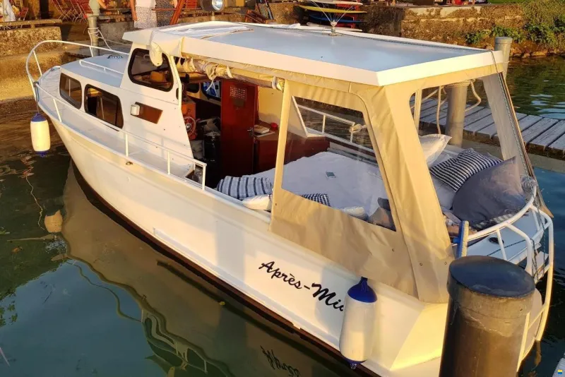 Wir haben die "Après-Midi" in 2006 von einem Niederländer erstanden. In 2007 liessen wir das Unterboot sandstrahlen. Nach einer Schweissarbeit am Rumpf in 2011 wurde der Innenausbau in der Kajüte neu gestaltet. Ebenfalls liessen wir einen Kühlschrank, einen Gasherd und eine Webasto Standheizung einbauen. Polster und Topper wurden von einem Spezialisten zum Schlafen in der Kajüte angefertigt; dazu eine Indirekte Beleuchtung mit LED. Eine grosse Liegefläche, welche zum Essen in zwei Bänke verwandelt werden kann, hat ein Fahrzeugbauer nach unseren Vorgaben erstellt. Eigentlich ist es für uns wie ein kleines Hausboot - Schwimmen, Chillen, Kochen, Schlafen, gemütliches langsames Fahren auf dem Zugersee. Direkt aus Holland haben wir einen Kabelaring (dekoratives Tau rund um das Boot zum Schutz des Boots beim Anlegen) anbringen lassen. Vor acht Jahren haben wir eine grössere Investition getätigt; ein angehobenes Komplett-Aludach (isoliert mit Belichtung) gleichzeitig wurde ein neues Bootsverdeck auf Mass angefertigt. Das Boot ist vorgeführt (26.8.2022).