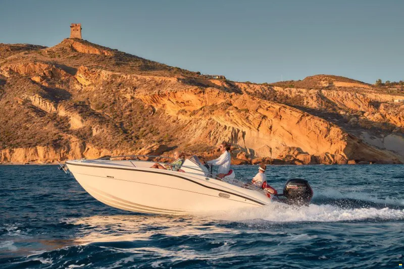 La nostra imbarcazione è dotata di un potente ma efficiente motore da 40 cavalli a 4 tempi Yamaha, garantendo consumi ridotti e un'esperienza di navigazione eccezionale. E' pertanto guidabile senza patente nautica oppure motorizzabile con motore fino a 150hp. La barca offre spazio sufficiente per accogliere fino a 8 persone, ideale per escursioni in gruppo. Comfort a bordo: impianto stereo Bluetooth con 2 casse, serbatoio benzina da 125 litri per lunghe navigazioni, cuscineria prendisole ultra confortevole ed estendibile a prua, tavolo per pranzi e aperitivi, tendalino per ripararsi dal sole, dotazioni di sicurezza, ancora, bussola, scaletta di risalita, USB per la ricarica del cellulare Navigatore Garmin, solcometro, ecoscandaglio, separatore acqua dalla benzina.