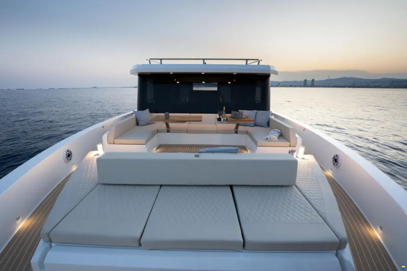 qui comprend trois zones clairement différenciées et parfaitement intégrées les unes aux autres. À l'arrière, un spectaculaire solarium chill-out comprend une table avec un seau à glace central. La salle à manger sur la terrasse centrale, à l'abri du soleil, peut accueillir plus de 10 personnes. La proue offre diverses possibilités de configuration, combinant le solarium principal, le grand canapé et les tables,
