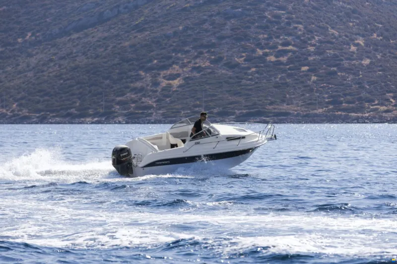 Questa barca nuova viene consegnata con un ricco equipaggiamento aggiuntivo: Seadeck in effetto teak marrone per pozzetto e cabina, tendalino e tenda parasole, copertura parziale, serbatoio carburante in acciaio inox con indicatore di livello, trim tabs, volante in legno, cuscino prendisole a prua, tavolo pozzetto e poggiapiedi in acciaio inox. La linea di colore blu sullo scafo bianco conferisce un tocco sportivo. A seconda della motorizzazione scelta, è possibile anche l'omologazione per il Lago di Costanza (Bodensee) - contattateci, saremo lieti di consigliarvi.