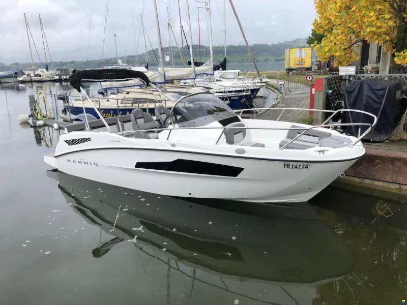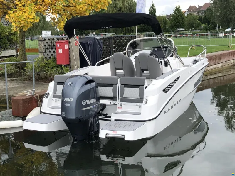 Offenes Konsolenboot mit Mittelkonsole, praktischer Kabine, Sitzgruppe hinten, Radio, iPod-Anschluss, Tiefenmesser, Geschwindigkeitsmesser, Batterie, Anker, Feuerlöscher, Bluetooth-Konnektivität, Badeleiter, Bimini-Top mit Edelstahlgestänge Version extragross, Getränkehalter, Polsterung für Mittelsitz und Zusatzsitz bb und stb, Tisch im Cockpit, Swivel Steuerstand (Einzelsitze), Cockpitpolster Charcoal spot, Badeplattform 2 Stück mit SeaDeck, Füllpolster für Bugliege, hydraulische Lenkung, Lenkrad Karnic Delux,