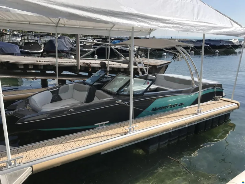 Découvrez ce superbe MasterCraft NXT22, un modèle polyvalent, idéal pour les familles comme pour les fans de wake ou ski nautique. Avec ses couleurs originales gris et turquoise, ce bateau se distingue immédiatement par son style moderne et sportif.