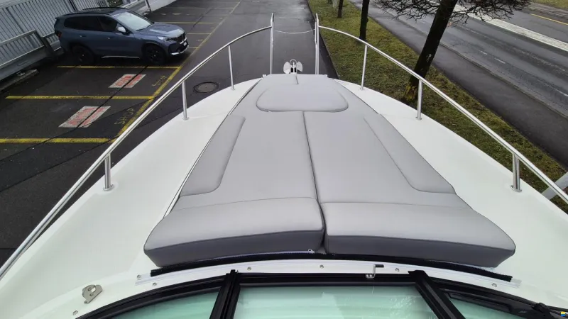 Mercury Active Trim, Cockpitpolsterung: STONE, Bodenbelag: BROWN, Captain’s Package: Bimini Sonnendach, Cockpitdecke, Anlegescheinwerfer, Scheibenwischer STB, Heckdusche, Bugdusche, Flaggenmast mit Sockel, Fender Clips, Fiberglass Sport Spoiler m/Bimini Dach, Bimini Camperverdeckpaket, Liegematte Bugdeck, Cockpittisch Teak rechteckig, klappbar mit Liegepolster, Cockpitboden SeaDek geklebt, Landanschluss (inkl. Konv./Kabel 220V/50), Cockpitkühlfach 12V