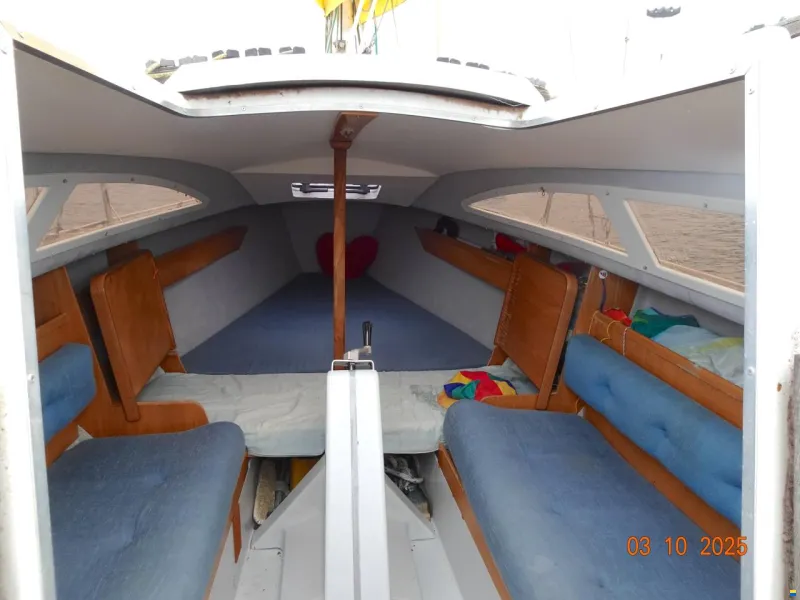 7,65m x 2,45m / Tiefgang 1,60/0,70 / Verdrängung: 1280kg / Ballast 600kg (über 50kg aufrichtende Kraft am Masttop bei 90°Kränkung) / 4 Kojen m. Polstern / sehr viel Stauraum / technisch OK, aber die Aussenhaut hat div. Ablagerungen, braucht neuen Glanz/Anstrich…das laufende Gut sollte gewaschen werden und manches erneuert werden...