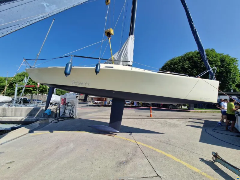 Bateau avec coque en composite, mât aile orientable en carbone, beaupré rétractable pivotant en carbone.