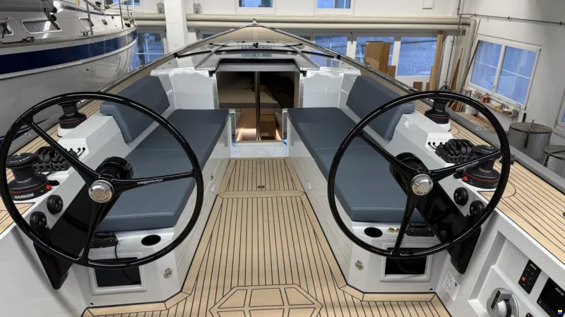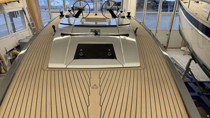 Saffier 33 Demo-Yacht Nov. 2025 mit 'dusty grey' Rumpf und light grey Cockpit und Deck. Elektro Torqueedo Antrieb und Carbon-Lake-Rigg.