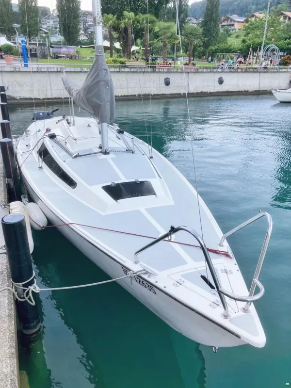 Sprotliches Segelschiff mit guten Segeleigenschaften, Aussenborder, ab MFK im Juni 2025. Geräumige Kabine. Badeleiter, mit konfortablem Einstieg ins Wasser.